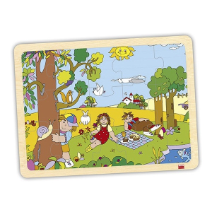 Puzzle de doble cara: por una uno de 32 piezas (67x32 cm) de ambiente marino y por otro 8 de 4 piezas (16x16,7 cm) con personajes del mismo.